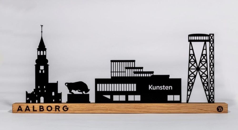 Denne Aalborg Skyline er et enkelt og unikt design i træ og metal bestående af seks forskellige motiver fra Aalborg by herunder: Budolfi Kirke, Cimbrertyren, Kunsten Museum of Modern Art og Aalborg Tårnet.