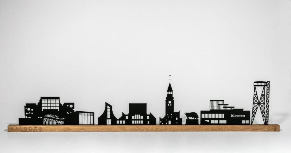 Denne Aalborg Skyline er et enkelt og unikt design i træ og metal bestående af seks forskellige motiver fra Aalborg by herunder: Musikkens Hus, Utzon Center, Budolfi Kirke, Cimbrertyren, Kunsten Museum of Modern Art og Aalborg Tårnet.